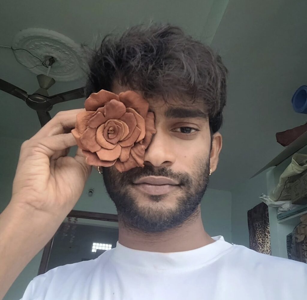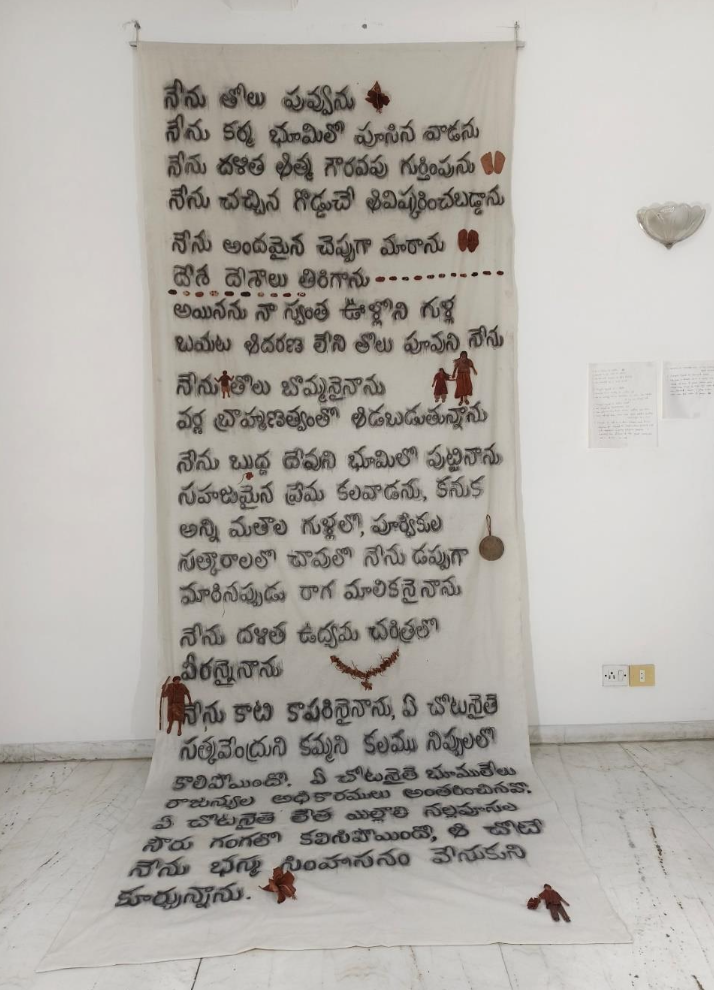 Hyderabad-based visual artist Madhukar Mucharla works primarily with leather, found objects, and natural pigments. His practice is rooted in Dalit history and identity, and he explores themes of caste, labor, and social memory through experimental techniques inspired by traditional leather craft and puppetry.